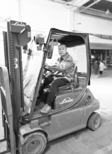 马晓峰驾驶叉车搬运图书。
