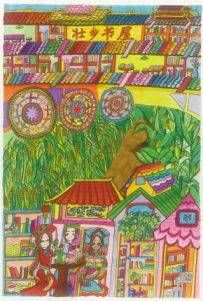 面对这部由中国少年儿童新闻出版总社出版的《“我的书屋·我的梦”——2019年农村少年儿童阅读实践活动优秀作品集》,让人欣喜的是,它不但有文字,还有很多入选的画作,孩子们运用了大胆的色彩、大胆的想象、大胆的线条,恣肆地描绘着他们的梦和憧憬,这些梦根植于他们生活的山乡旷野,又呼应着远方、星辰与大海。我尤其记得其中的一幅,那是一座高耸的书塔,那种拔地而起、直上云霄的气势,是一种象征,是一种隐喻,是这一代孩子想站到巨人肩上的渴望,是他们对祖国明天最美好的祝福和期待,也是中华民族必将走向复兴的昭示。